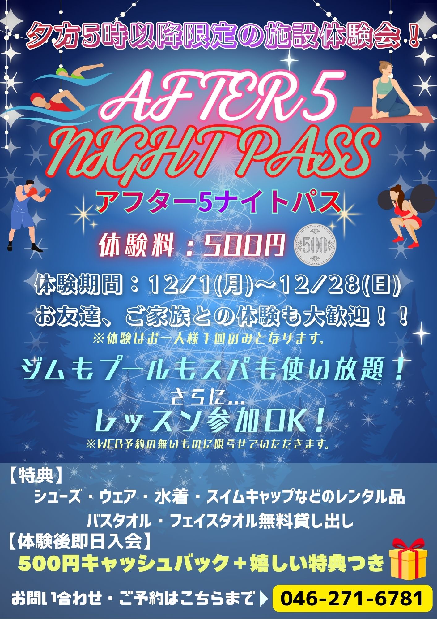 | 2025.12.01 | アフター5ナイトパス!!17時以降の体験会の詳細はこちらから |